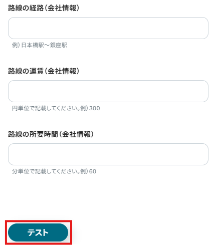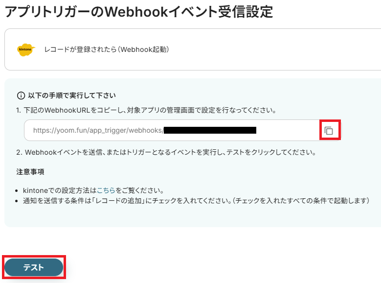 kintoneでのレコード登録が完了したら、「テスト」をクリックします。