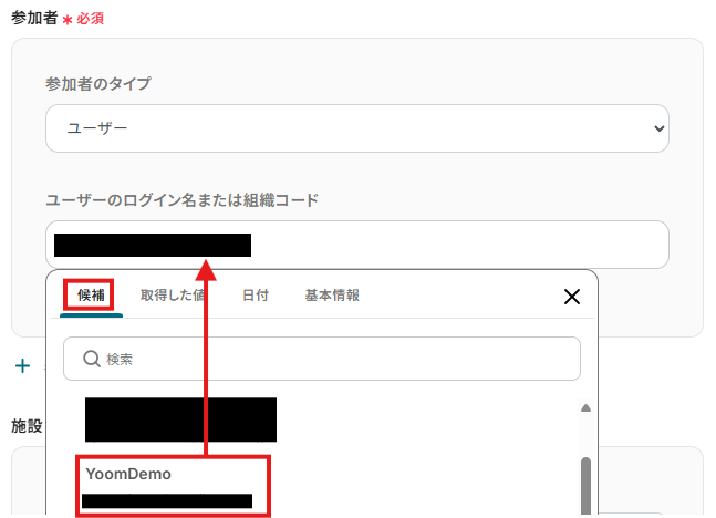 参加者:参加者タイプをデフォルトのまま「ユーザー」で進め、ユーザーのログイン名または組織コードを候補から選択していきます