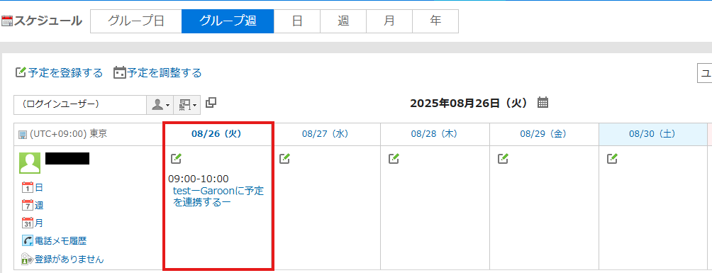 テストが成功すると、Garoonに予定が追加されますので一度、確認しておきます。