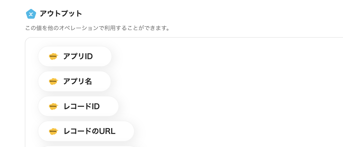 アウトプット情報は、「この値を他のオペレーションで利用することができます。」という注釈の通り、この後のステップで引用・活用できます。