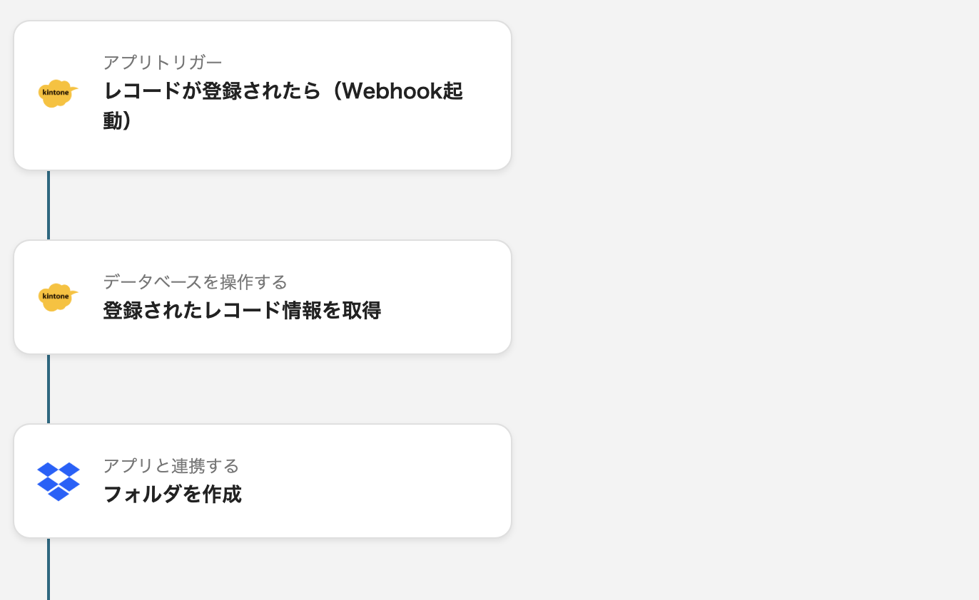 例えば、kintoneで顧客情報が新規登録されると、自動的にその顧客専用のフォルダがDropboxに生成され、顧客ごとの書類やファイルを整理できます。
