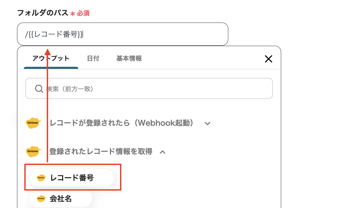 このフローを使用するにあたり、kintoneに登録されるレコード情報にはフォルダ名に使用する情報を設定する必要があります。