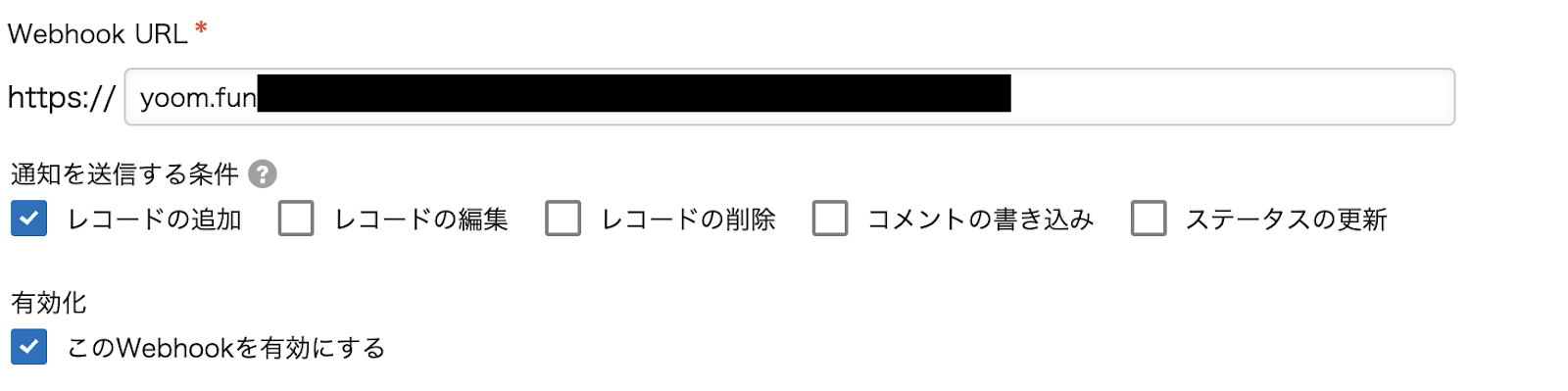kintone側でのWebhook設定時、【通知を送信する条件】は「レコードの追加」にチェックを入れてください。