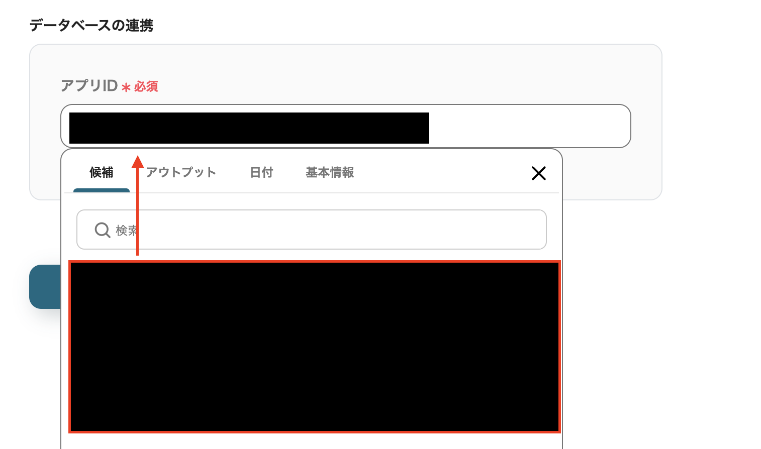 下にスクロールして、『データベースの連携』の「アプリID」に情報を入力し、[次へ]をクリックします。