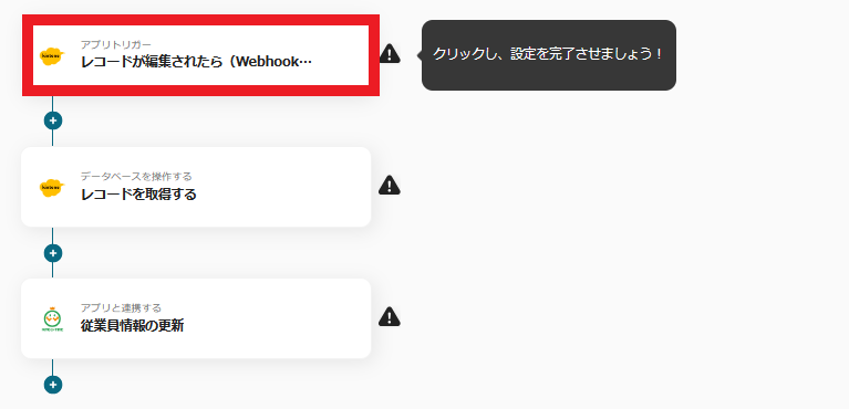 1.まず、一番上の「レコードが編集されたら(Webhook起動)」をクリックします。