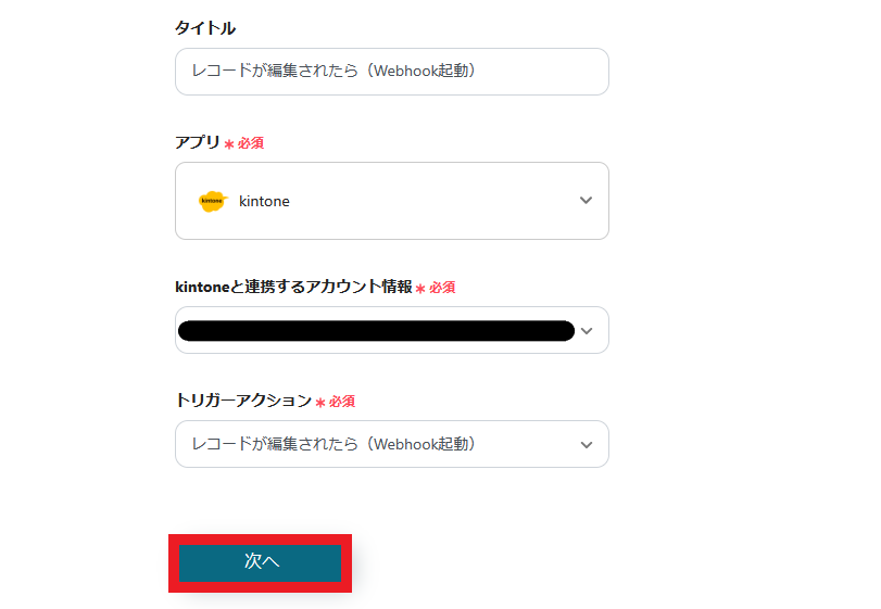 トリガーは、「レコードが編集されたら(Webhook起動)」を選択します。