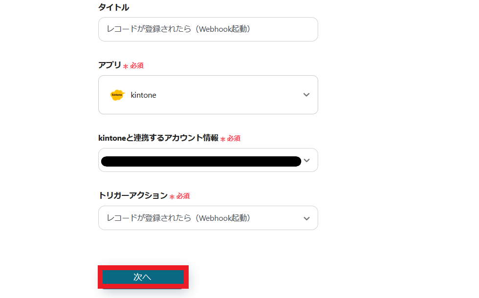 トリガーは、「レコードが登録されたら(Webhook起動)」を選択します。