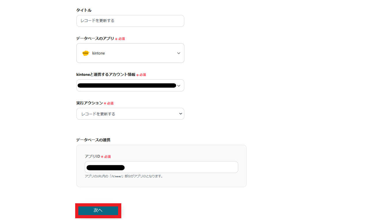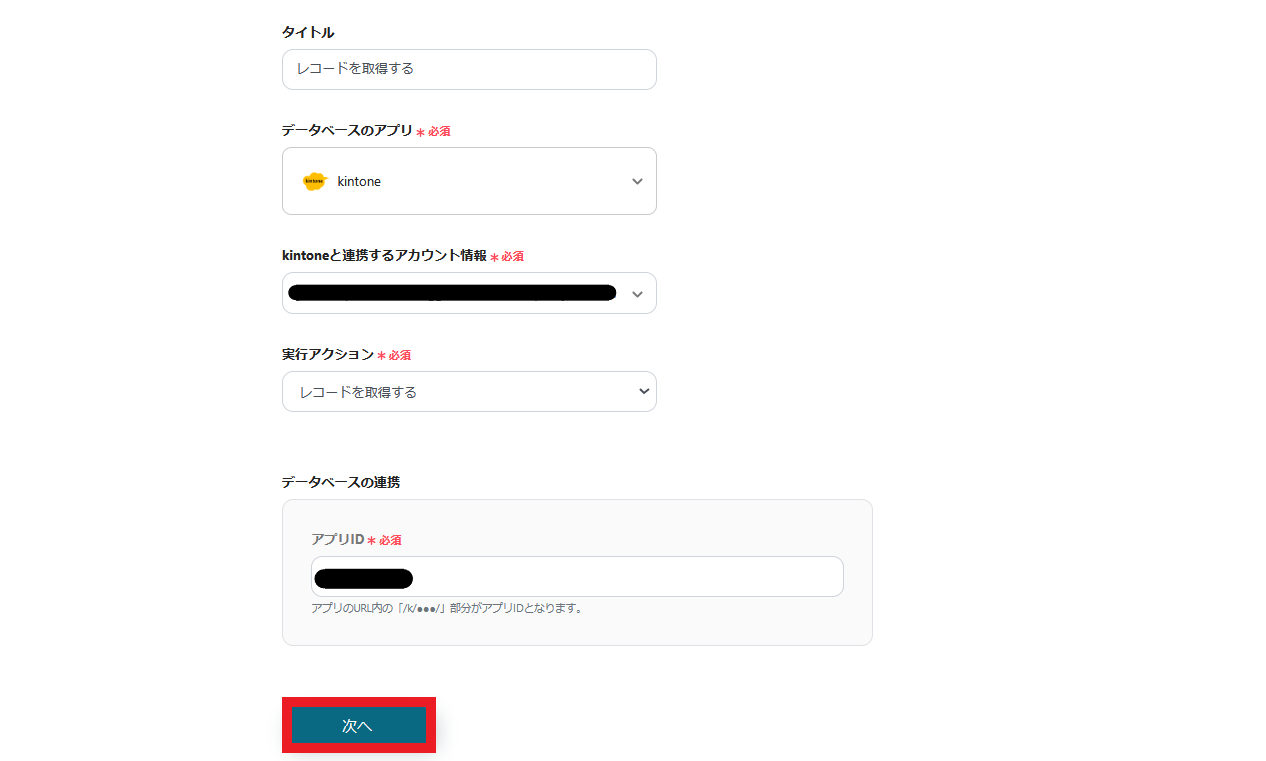 kintoneと連携するアカウント情報を入力します。