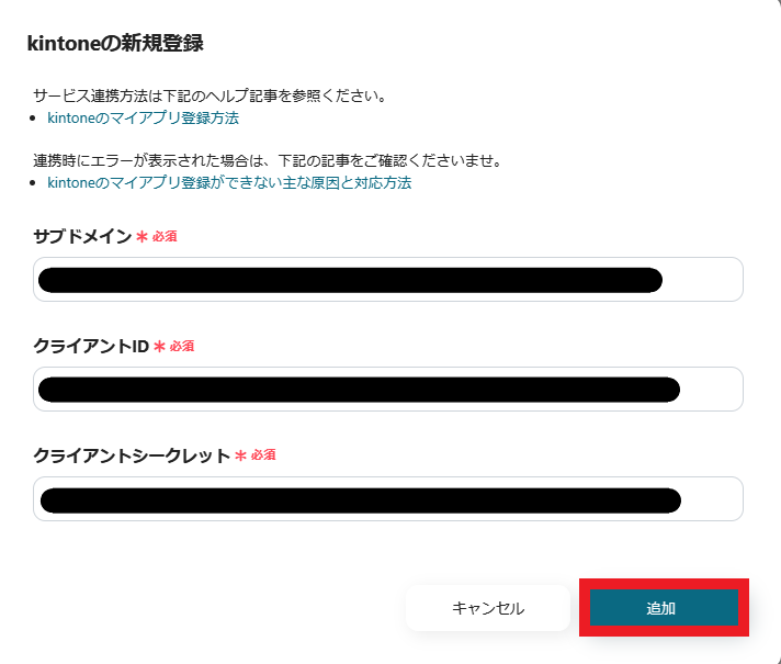入力後、「追加」をクリックすると、kintoneのマイアプリ登録は完了です。