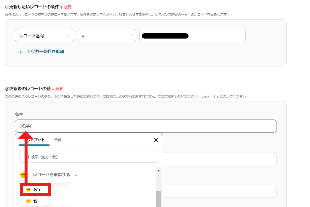 9.更新したいレコードの条件と更新後のレコードの値を設定していきます。