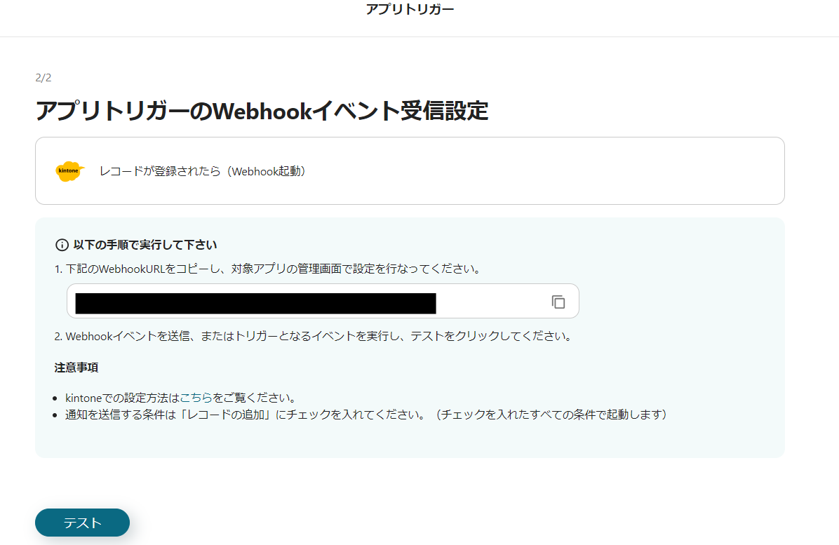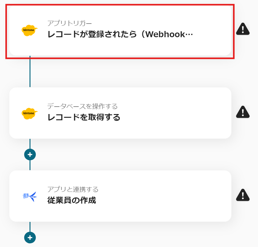 ・kintoneで「レコードが登録されたら」というトリガーを作成します。