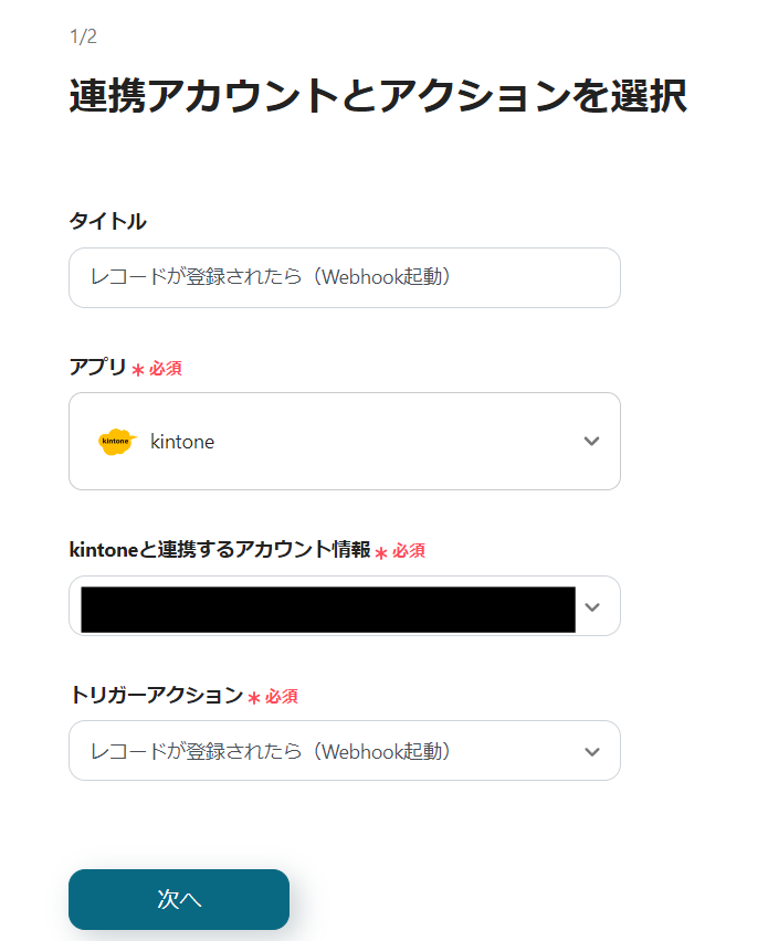 1) アクションは「レコードが登録されたら(Webhook起動)」を選択して、「次へ」をクリックします。