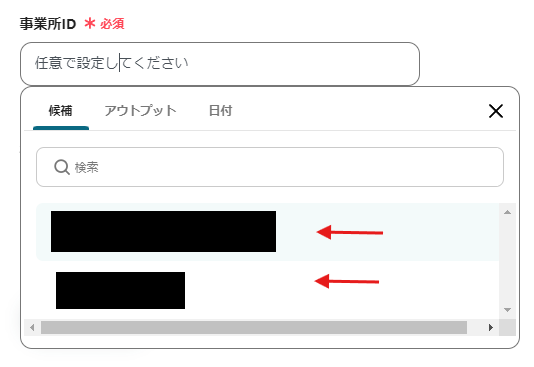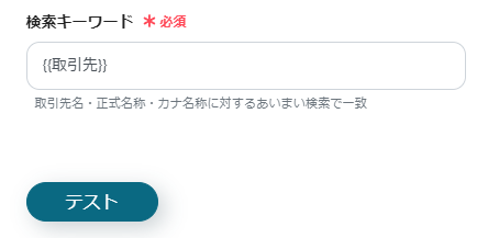 検索キーワード:取引先名・正式名称・カナ名称に対するあいまい検索で一致 [注意事項] freeeに登録済みの取引先を検索することが可能です。 今回は取得した値から設定しています。