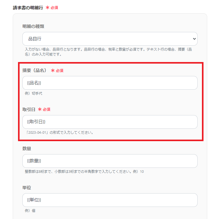 請求書の明細行の必須項目となっている「摘要(品名)」「取引日」 を入力してください。