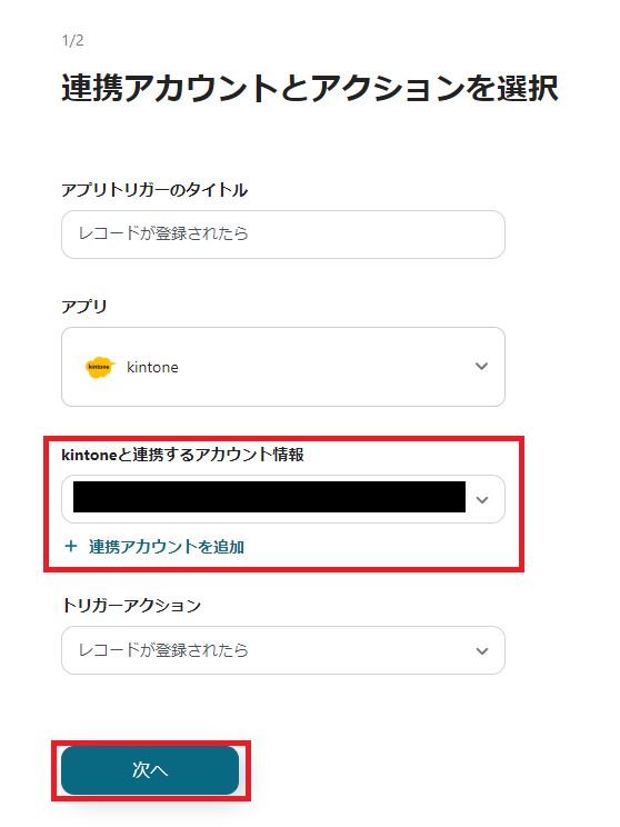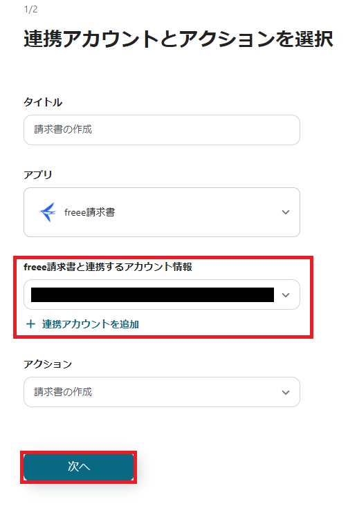 連携するアカウント情報を確認し、アクションはテンプレート通りのまま「次へ」をクリックして進んでください。