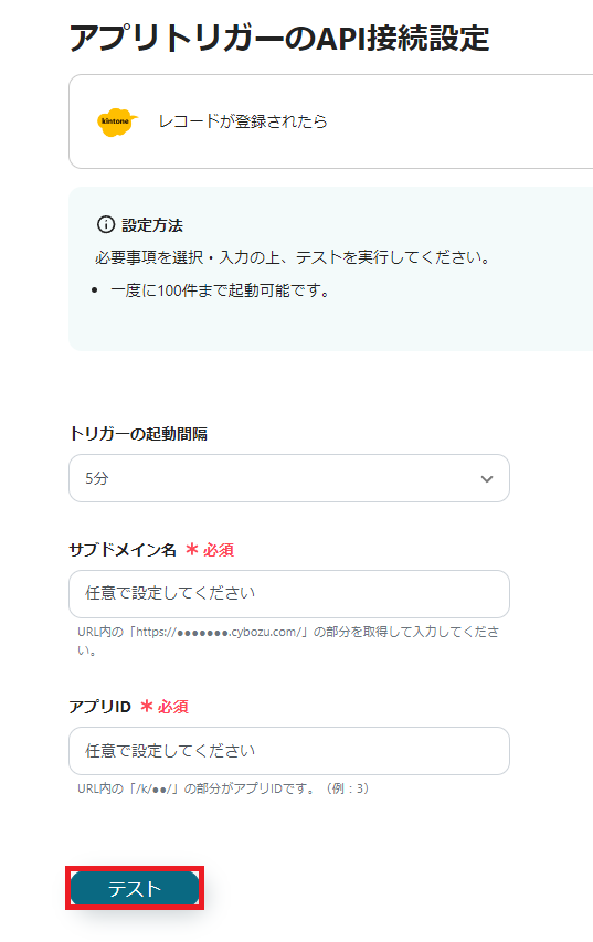 [設定方法] 必須項目の「サブドメイン」「アプリ名」 を入力しましょう。 一度に100件まで起動可能です。