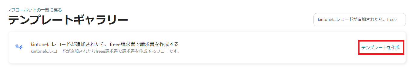 右上の検索窓で先ほどのテンプレートタイトル(kintoneにレコードが追加されたら、freee請求書で請求書を作成する)を入力して検索 します。 表示されたテンプレートの右側に青字で「テンプレート作成」 とあるので選択してください。
