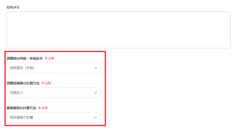 必須項目の「消費税の内税・外税区分」「消費税端数の計算方法」「源泉徴収の計算方法」を設定 してください。