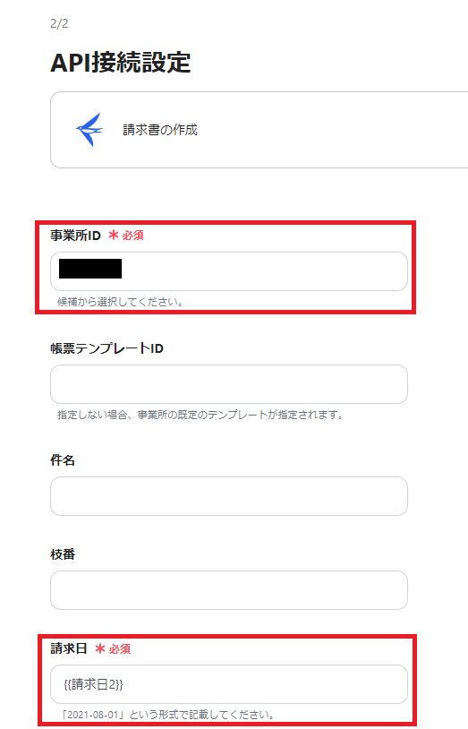 請求日:取得した値から設定しています。 「2021-08-01」という形式で記載してください。