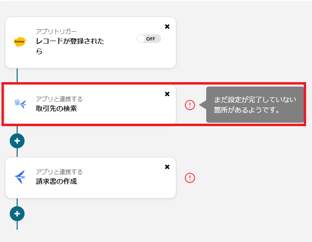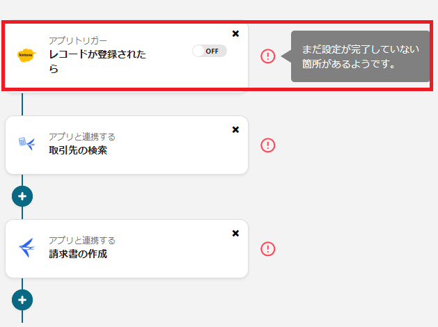 はじめに、kintoneとfreee請求書をYoomと連携します。 次に、トリガーでkintoneを選択し、「レコードが登録されたら」というアクションを設定します。 次に、オペレーションでfreee請求書を選択し、「取引先の検索」アクションを設定し、kintoneのレコード情報を基に取引先を特定します。 最後に、再度freee請求書の「請求書の作成」アクションを設定し、kintoneの情報と、前段で検索した取引先IDを紐付けて請求書を作成します。 ※「トリガー」:フロー起動のきっかけとなるアクション、「オペレーション」:トリガー起動後、フロー内で処理を行うアクション