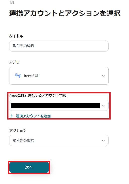 ステップ4:freee会計で取引先を検索する設定 次は「取引先の検索」 の設定です。