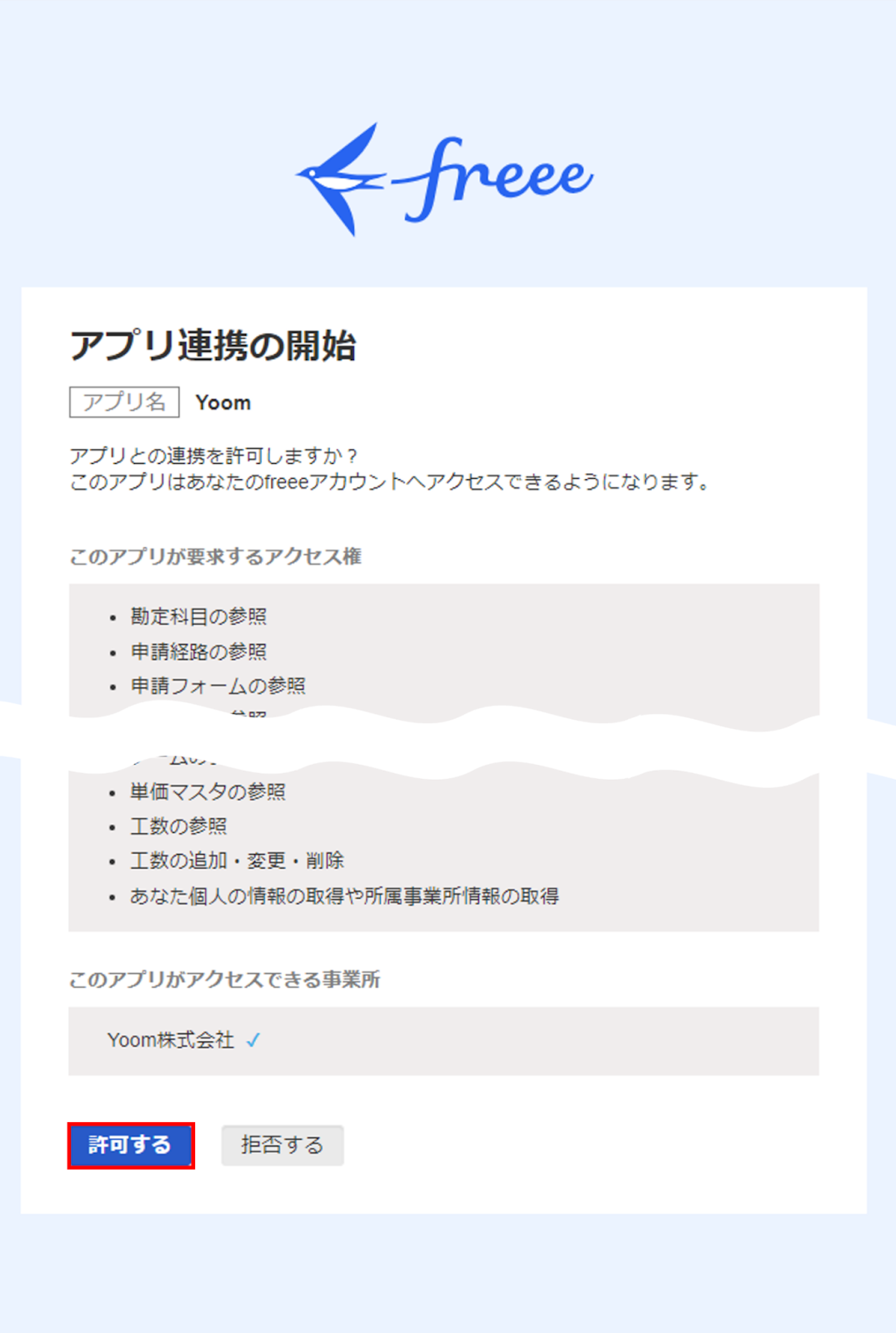 freee会計 (1)アプリの一覧からfreee会計 を選択 (2)アプリの連携開始画面で、許可するをクリック(freee請求書を連携する際と同様の画面が表示されます)
