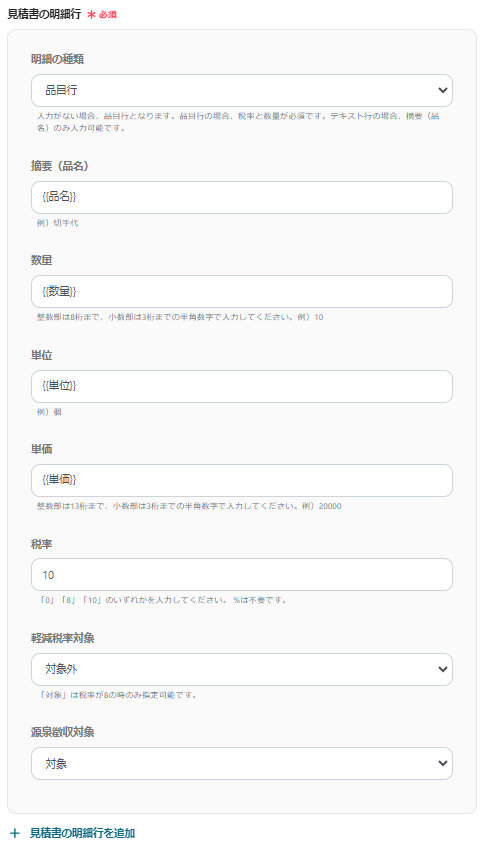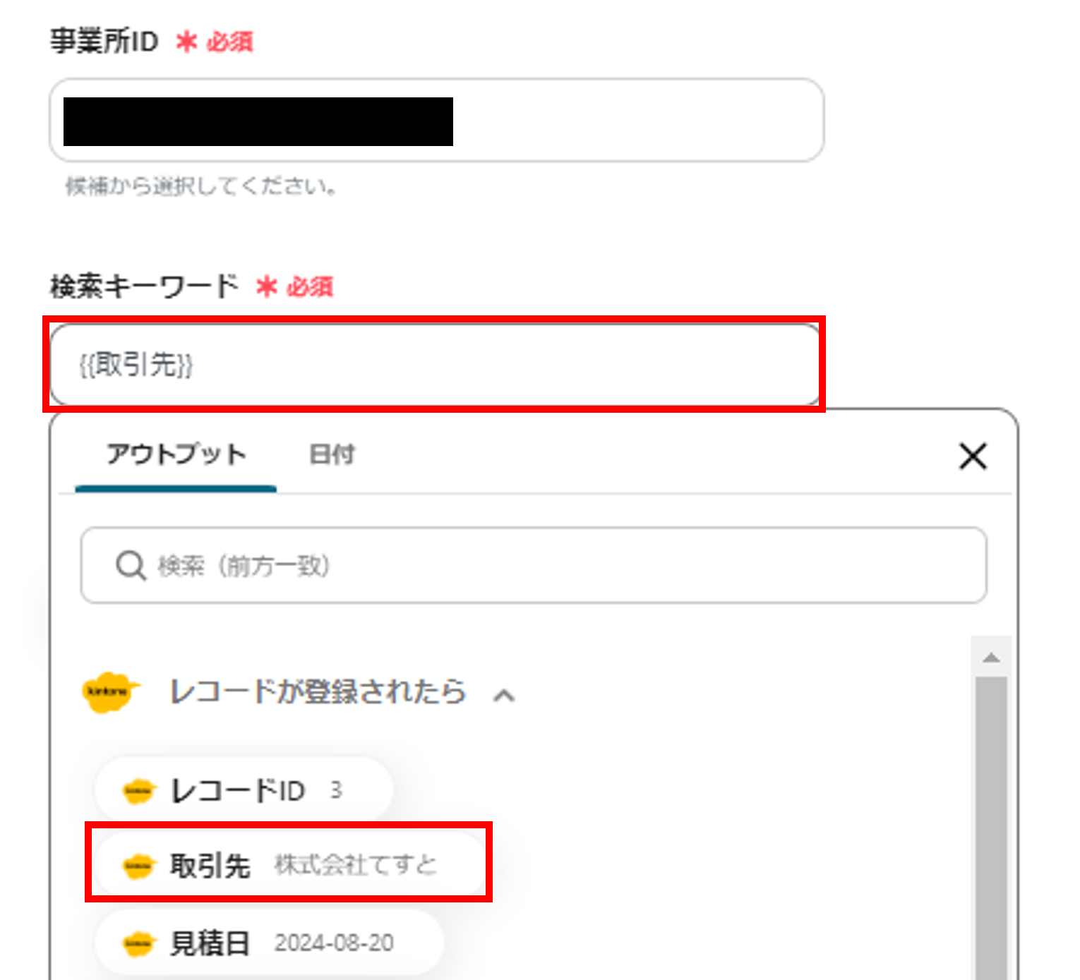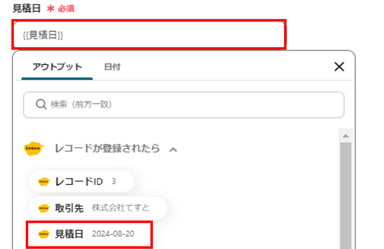 ~見積書の明細行~(ここでは、「レコードが登録されたら」のアウトプットを紐付けるように設定)