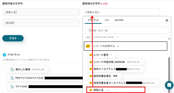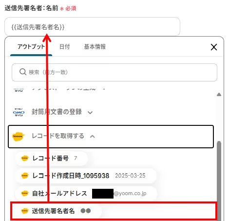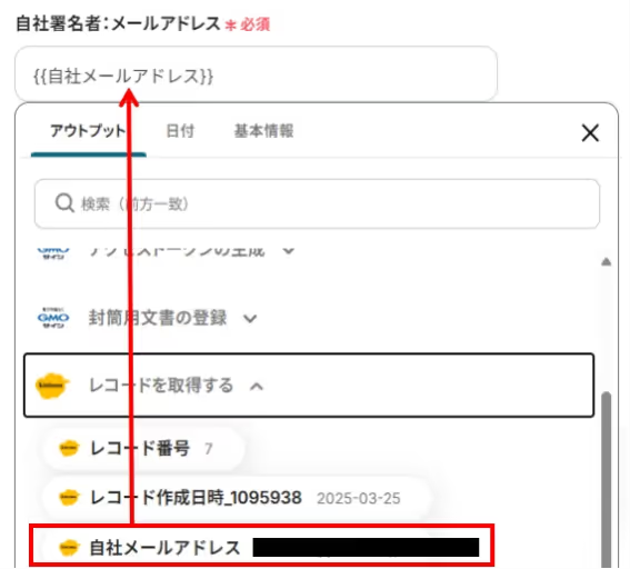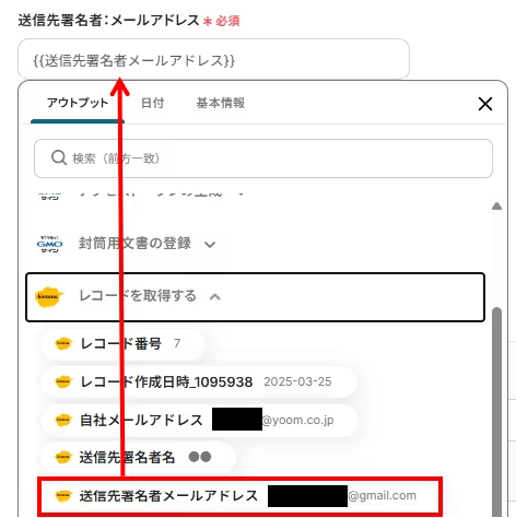 kintoneアプリのレコードに送信先署名者メールアドレスの項目がある場合は、入力欄をクリックするとアウトプット(取得した値)が表示されるので下記のように選択することも可能です。