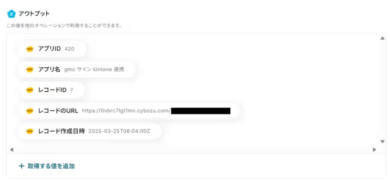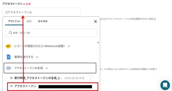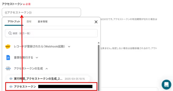 「アクセストークン」 も同様に、アウトプット(取得した値)から設定してください。