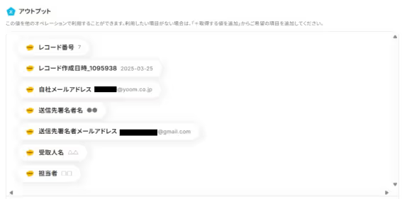 kintoneアプリのレコードにメールアドレスの項目がある場合は、入力欄をクリックするとアウトプット(取得した値)が表示されるので下記のように選択することも可能です。