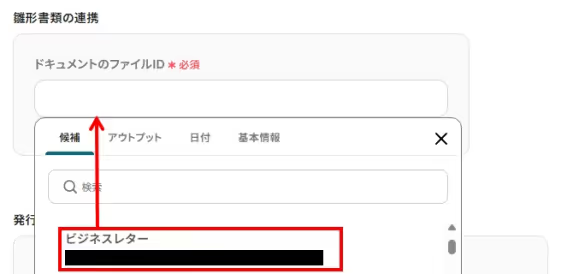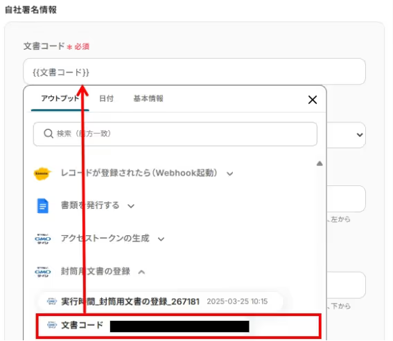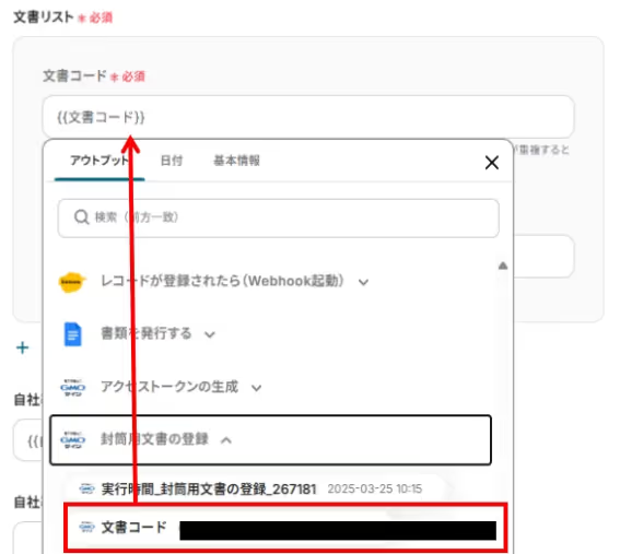 「文書コード」:アウトプット(取得した値)から文書コードを選択してください。