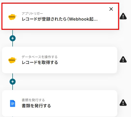 まずはkintoneアイコンの「レコードが登録されたら(Webhook起動)」をクリックします。