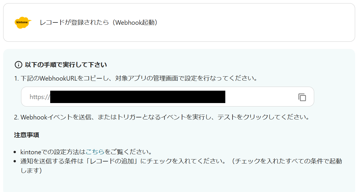 以下の画面でこの記事を参考に、アプリトリガーのWebhookイベント受信設定をしてください。