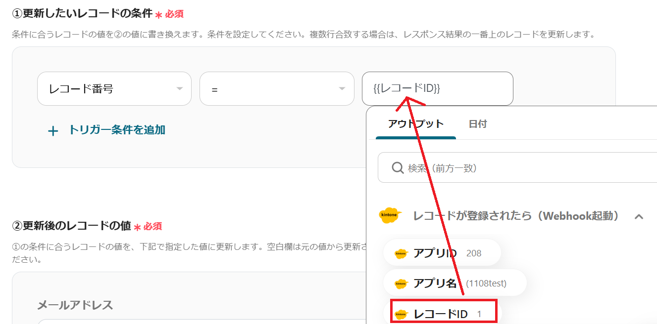 更新したいレコードの条件も、画像のように設定してください。
