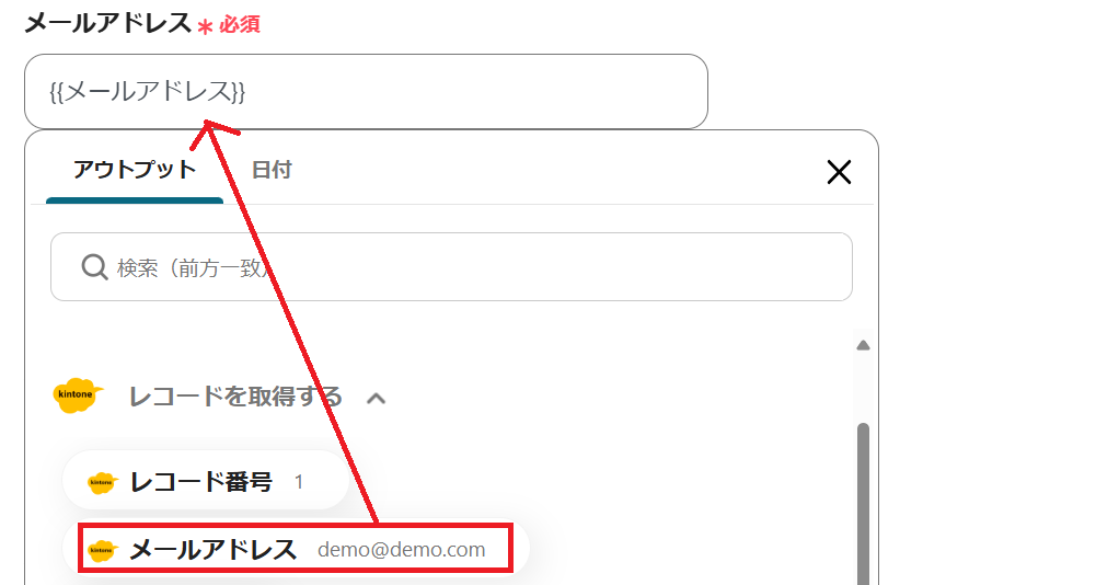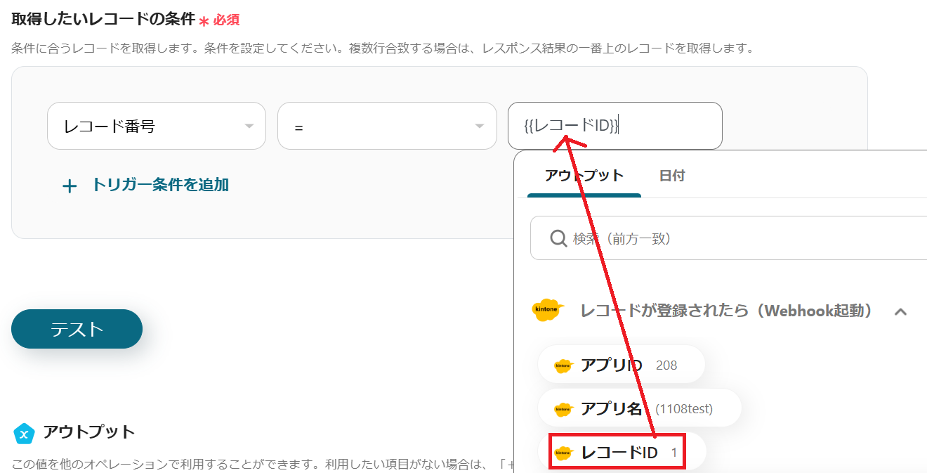 {{レコードID}}をアウトプットから選択したら、テストしましょう。
