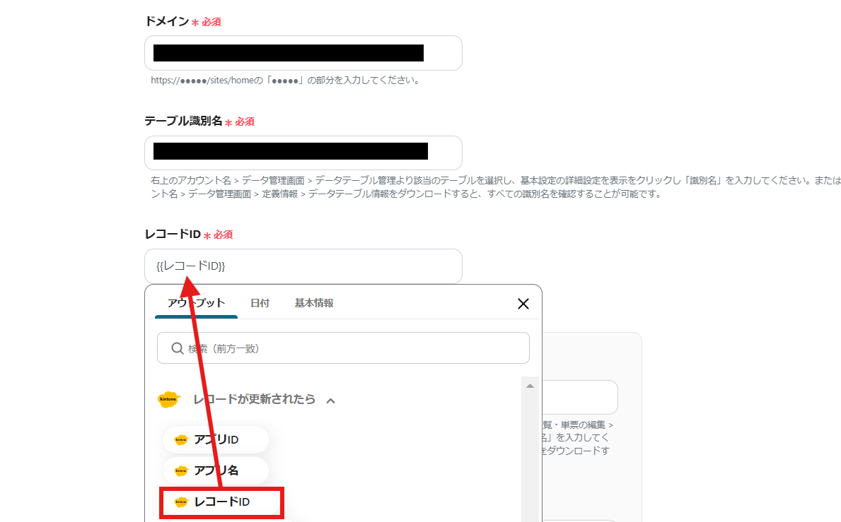 3.ドメイン、テーブル識別名、レコードIDを設定してください。