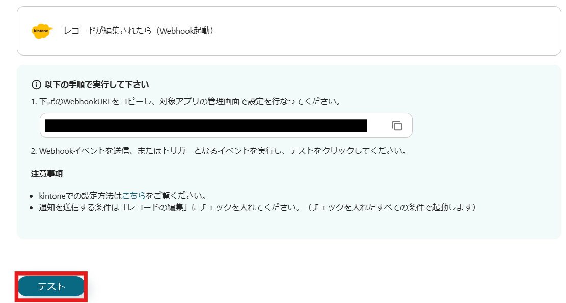 詳しい手順は、以下のリンクから確認してくださいね。kintoneでWebhook設定を行う