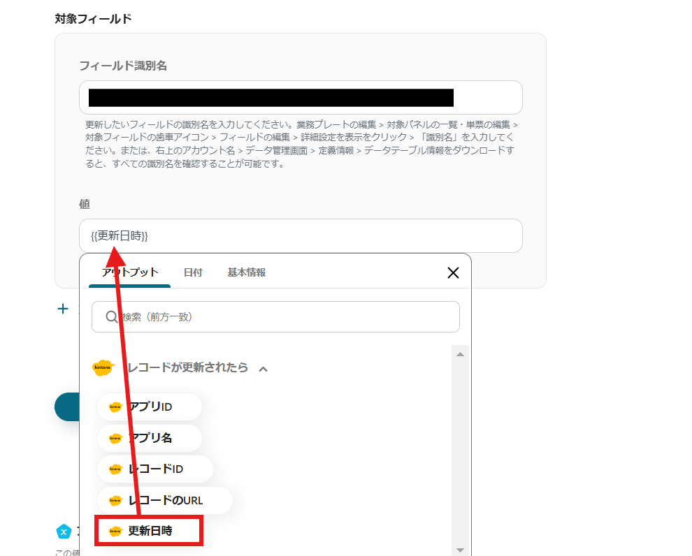 値は入力欄をクリックすると先ほどのようにkintoneの情報が表示されるので、その中から更新したい値を選択してください。