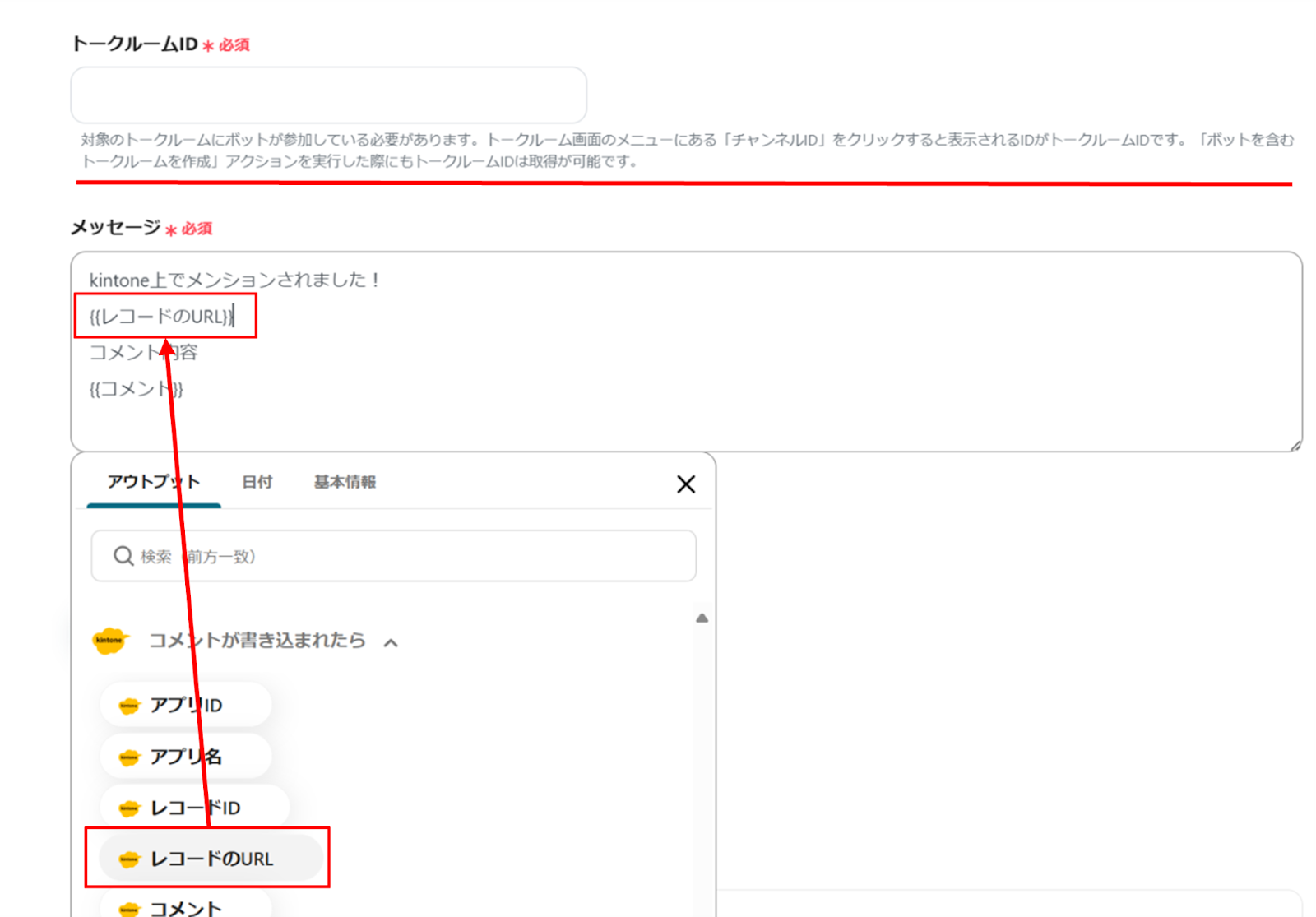 画像のように文中にアウトプットを含めることで、kintoneの情報を引用できます。