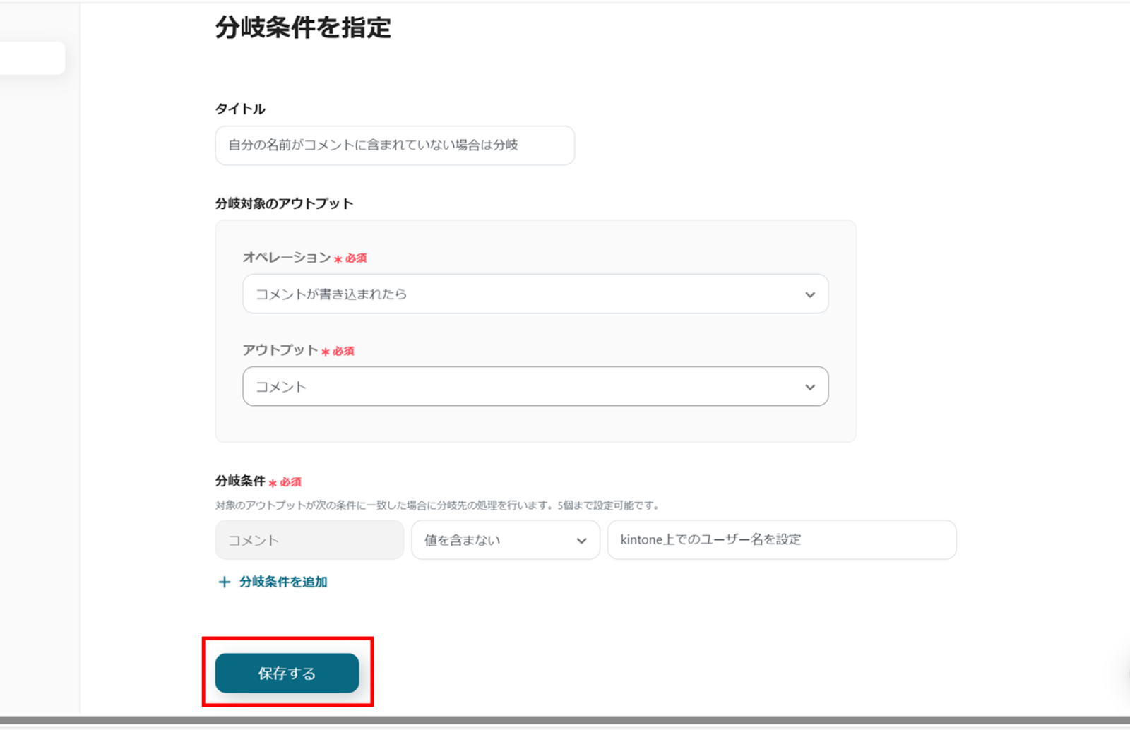 分岐条件は「値を含まない」をプルダウンから選択し、下記画像の「kintone上でのユーザー名を設定」と記載されている部分には、kintoneのユーザー名を直接入力してください。これにより、特定のユーザー宛てのコメントのみを検知して、メッセージを送信できます。
