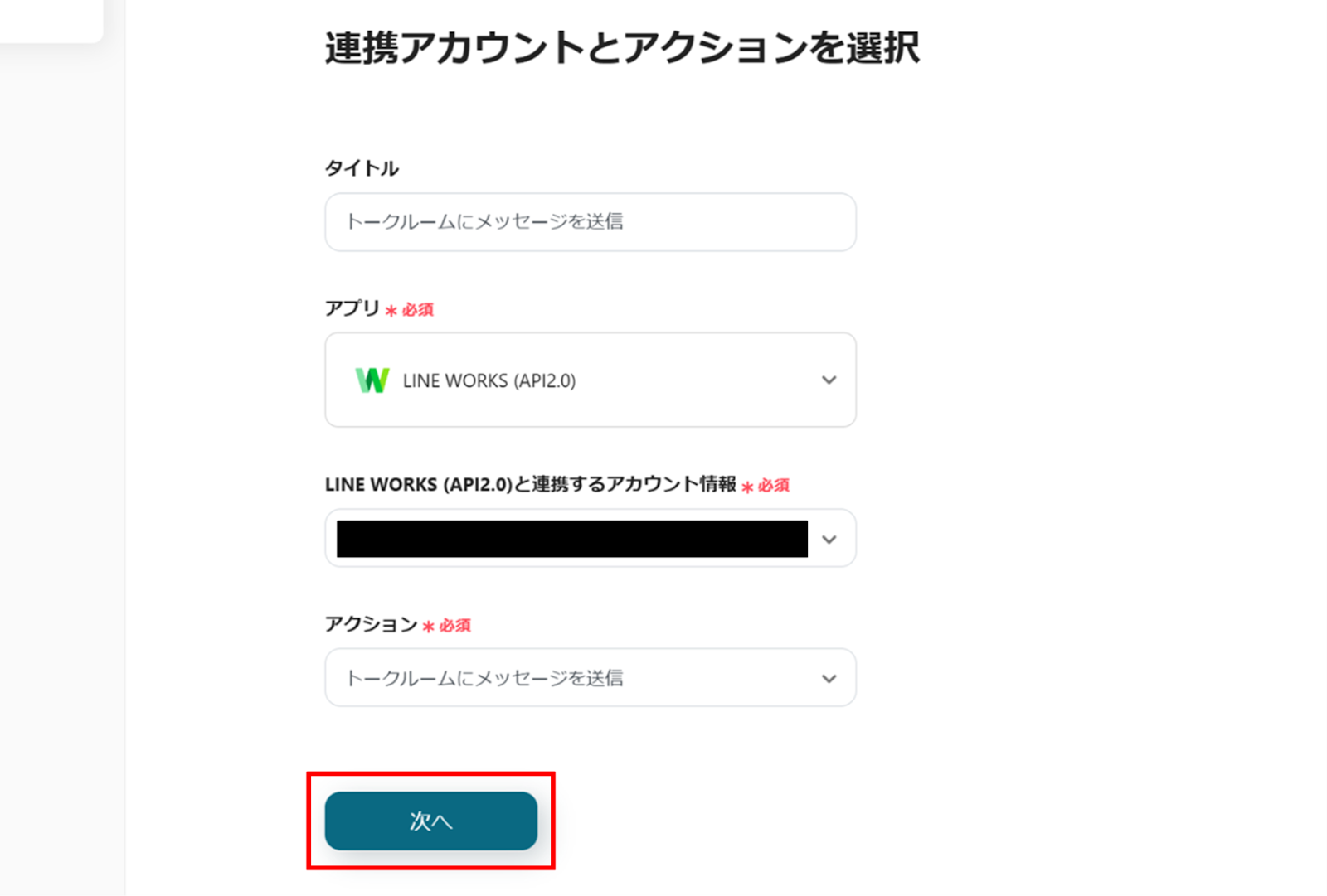 (2)LINE WORKSの「連携アカウントとアクションを選択」画面から、LINE WORKS (API2.0)と連携するアカウント情報に誤りがないかを確認し、アクションは「トークルームにメッセージを送信」のままで「次へ」をクリックします。