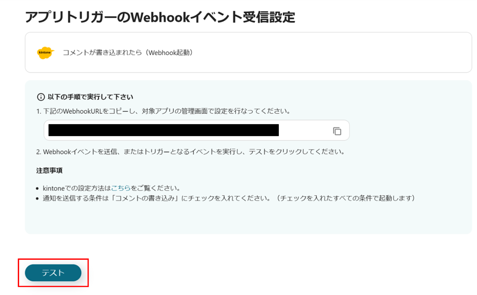 (3)「アプリトリガーのWebhookイベント受信設定」画面から、WebhookURLをコピーし、kintoneの管理画面で設定を行なってください。
