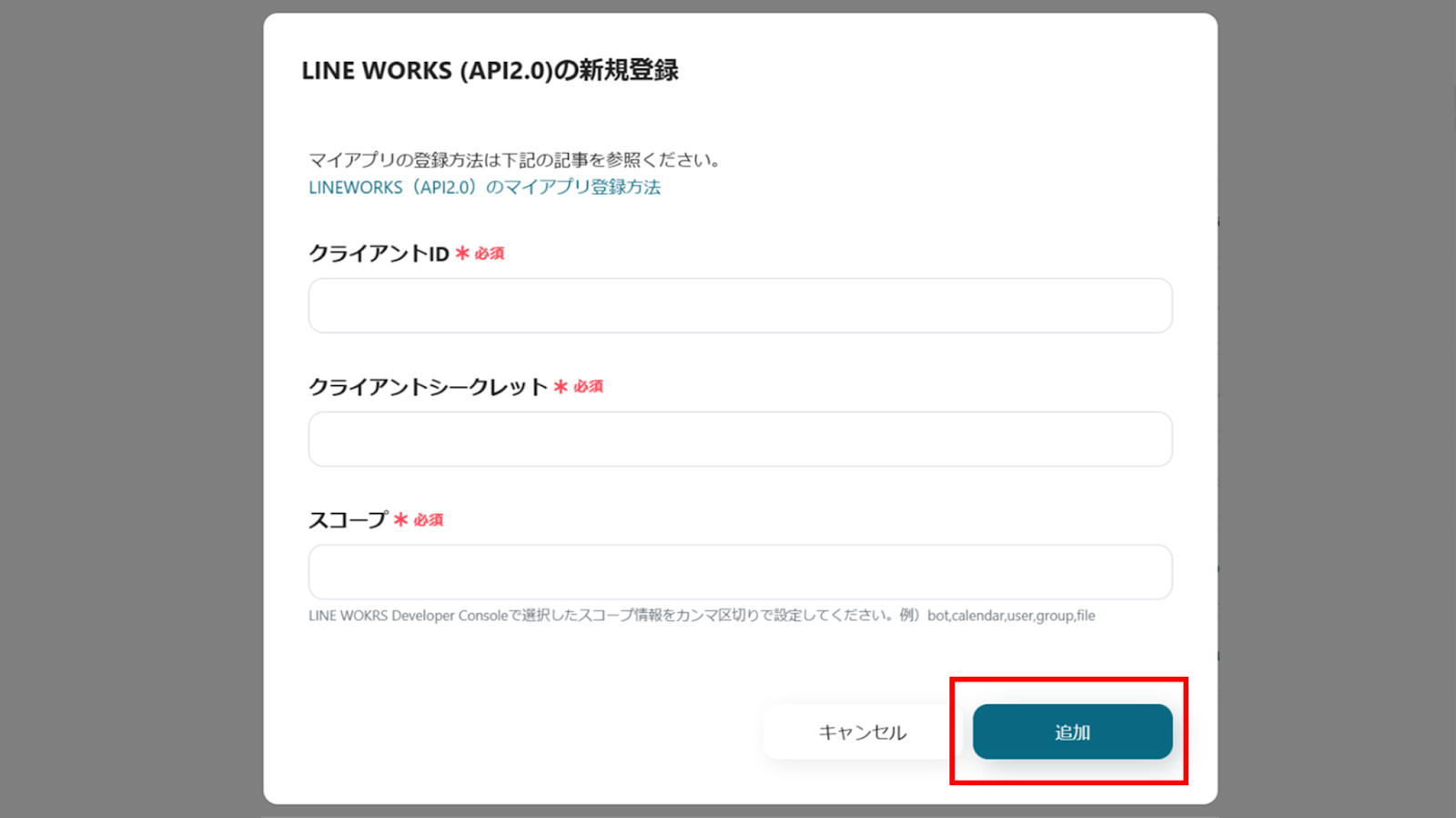 (6)LINE WORKSの新規登録画面が出るので、クライアントID、クライアントシークレット、スコープを入力し、「追加」をクリックします。