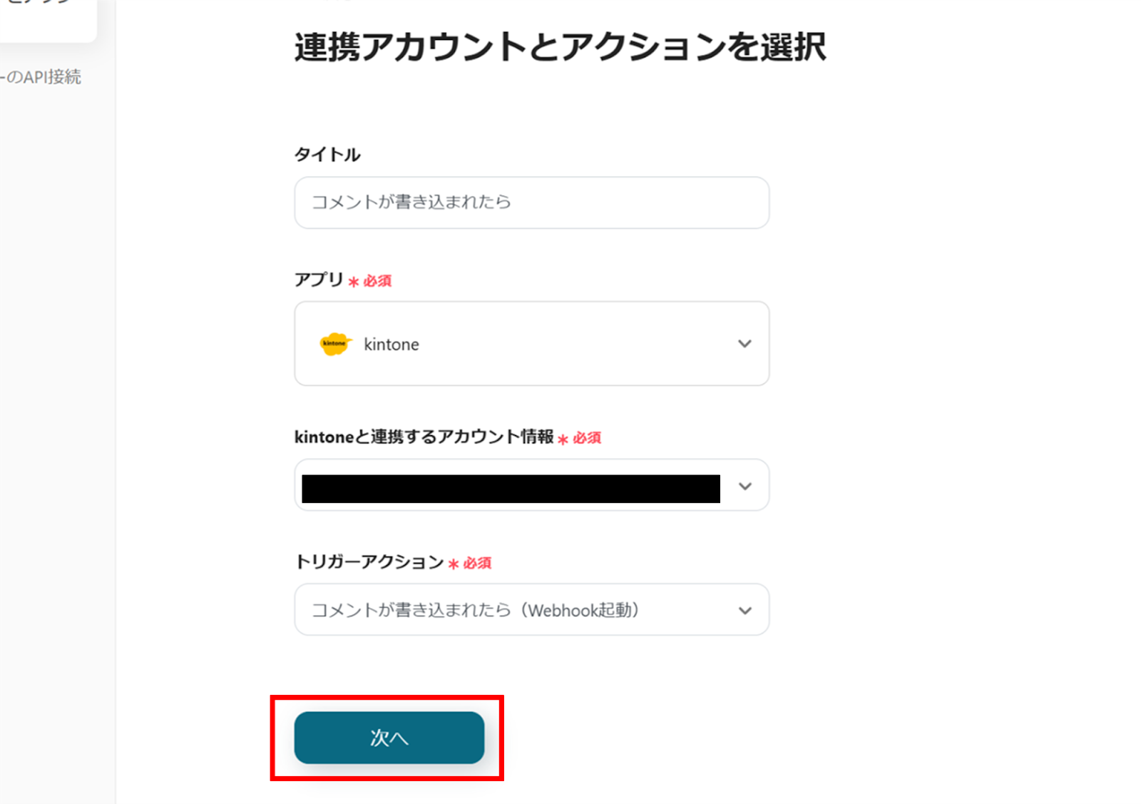 (2)kintoneの「連携アカウントとアクションを選択」画面から、kintoneと連携するアカウント情報に誤りがないかを確認し、トリガーアクションは「コメントが書き込まれたら(Webhook起動)」のままで「次へ」をクリックします。