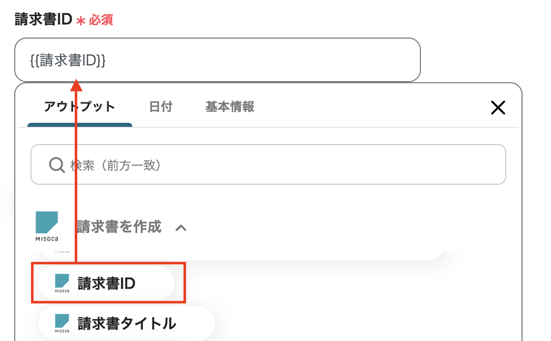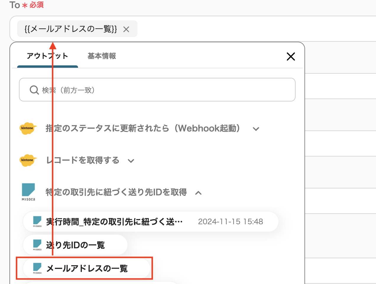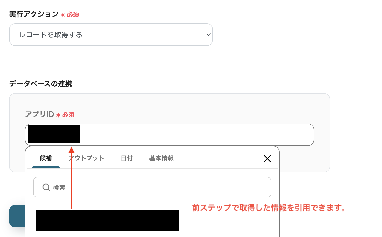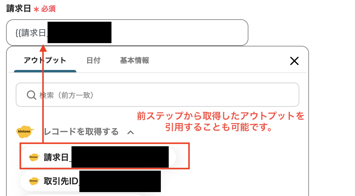 以下の画面のように、入力バーをクリックすると、前ステップで取得した情報が展開され、内容を引用することができます。