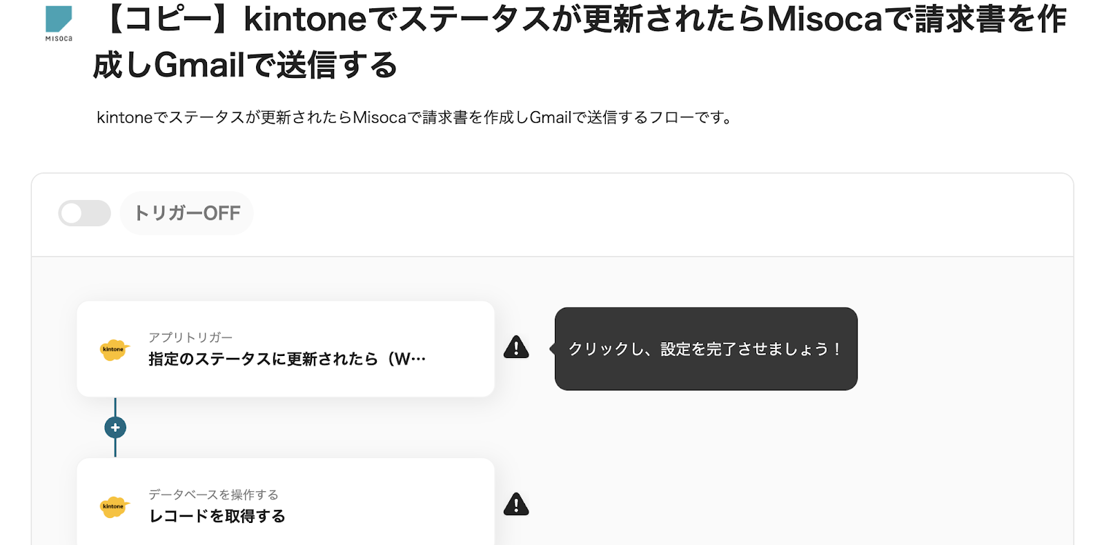 では、「kintoneでステータスが更新されたらMisocaで請求書を作成しGmailで送信する」のテンプレートを使ったフローボットを作成していきましょう。
