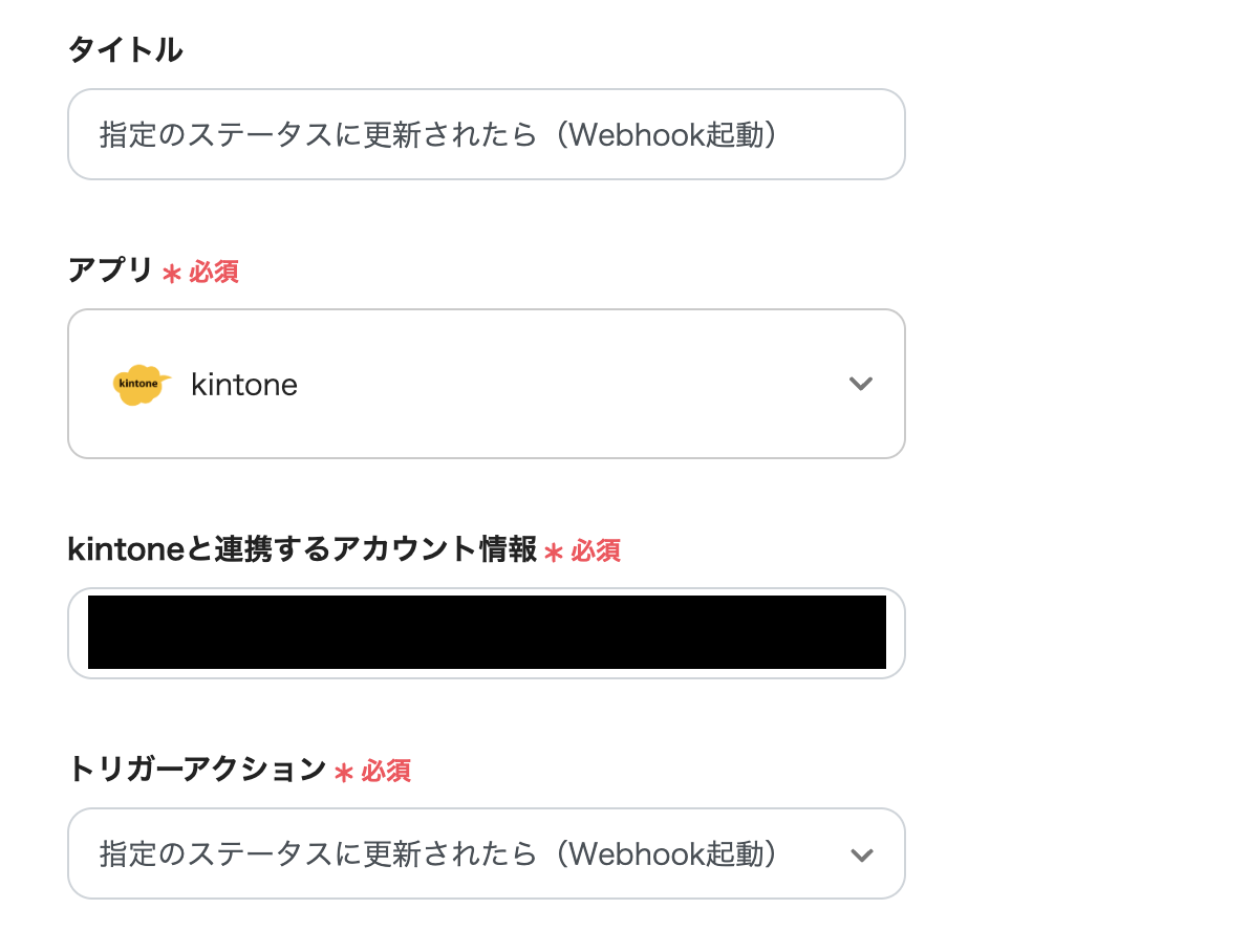 kintoneと連携するアカウント情報を入力し、トリガーアクションは「指定のステータスに更新されたら(Webhook起動)」のままにし[次へ]をクリックします。