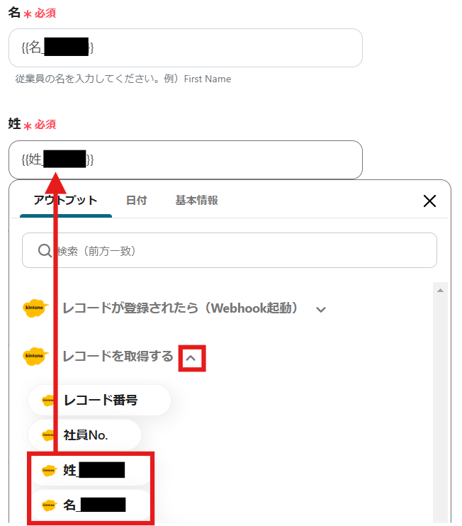 「レコードを取得する」のアウトプットから「姓」、「名」を選択します。