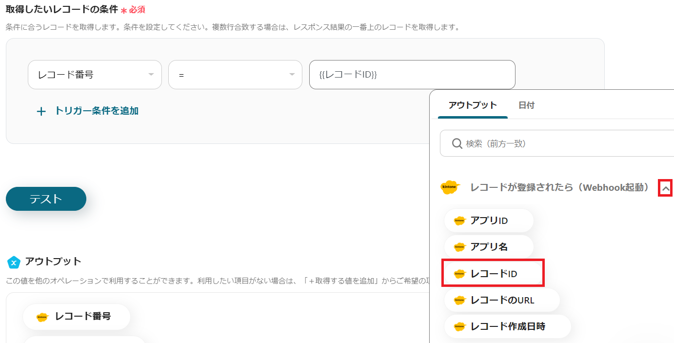 レコードを取得するのアウトプットには、kintoneで登録した項目が表示されます。