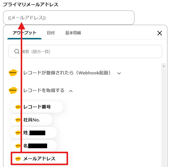 「レコードを取得する」のアウトプットから選択します。